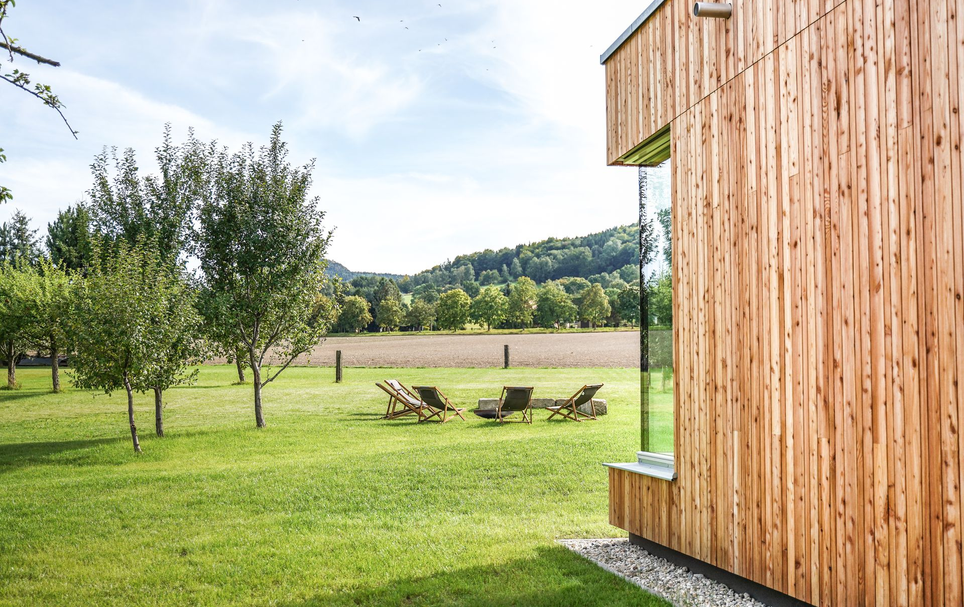 Die Sauna mit Ruheraum im ersten Obergeschoss und mit Zugang zur weiten, sich nach Süden öffnenden Dachterrasse spendet Ihnen den entspannten Ausklang nach einem aktiven Tag. Die Terrasse fängt selbst in den Wintermonaten die Sonne ein und bietet einen ansprechenden Raum, um den Blick auf die umliegenden Felder und Berge zu erleben.