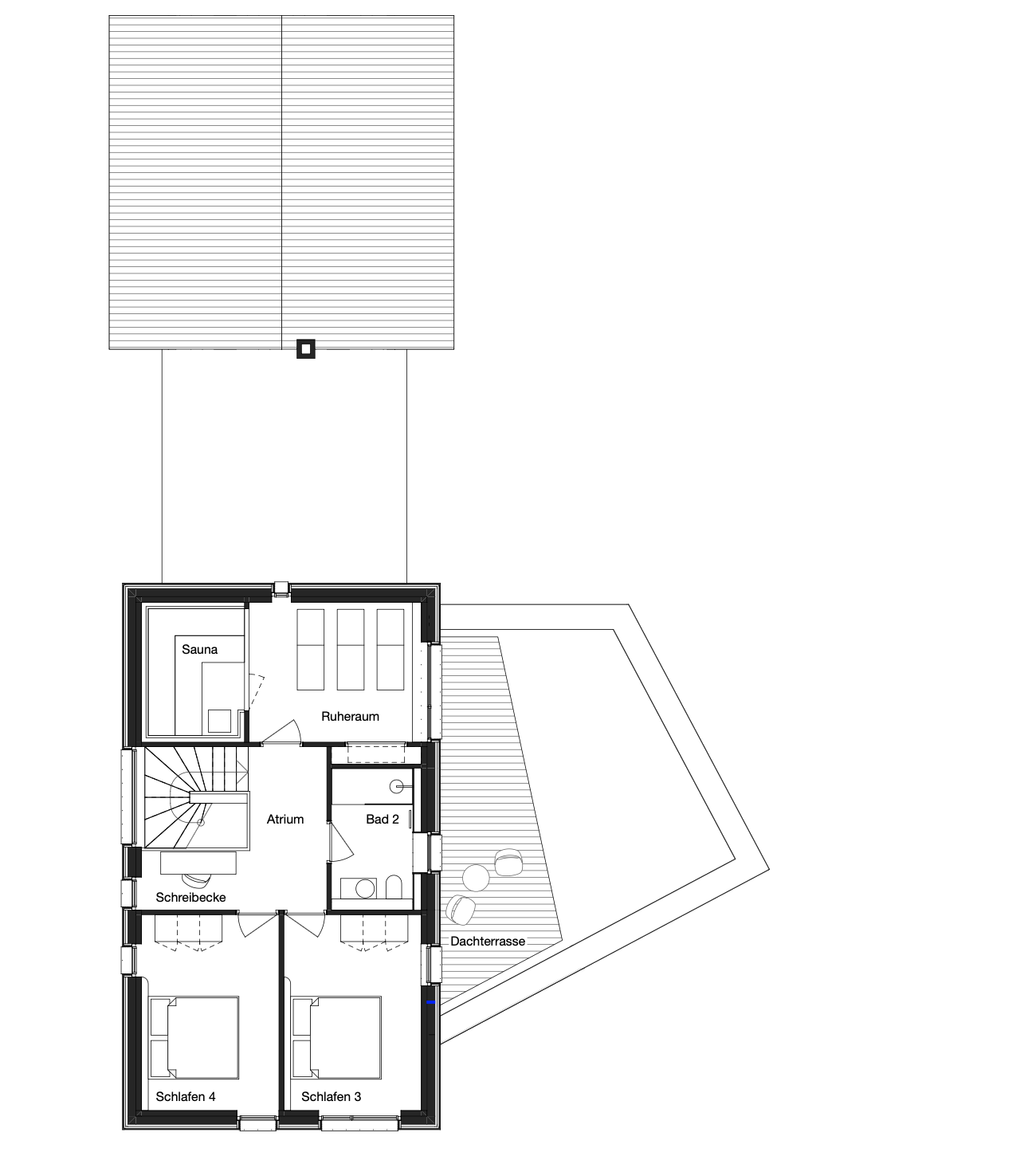 - Roof terrace (south-east) with access from sauna, bathroom and bedroom